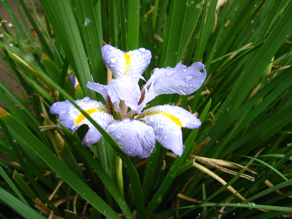 Gratuitous Iris Photo June 8, 2003 Now that I have a camera I carry everywhere, I'm more likely to catch a photo of something incidental. Here's a photo of raindrops on a small iris outside the front door. Click it for the original high-resolution image (my current desktop image). Photos